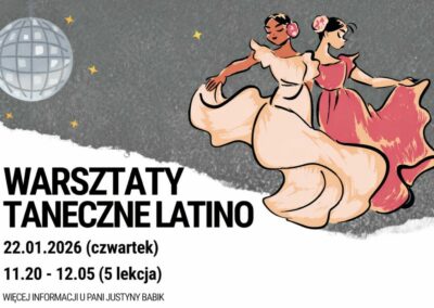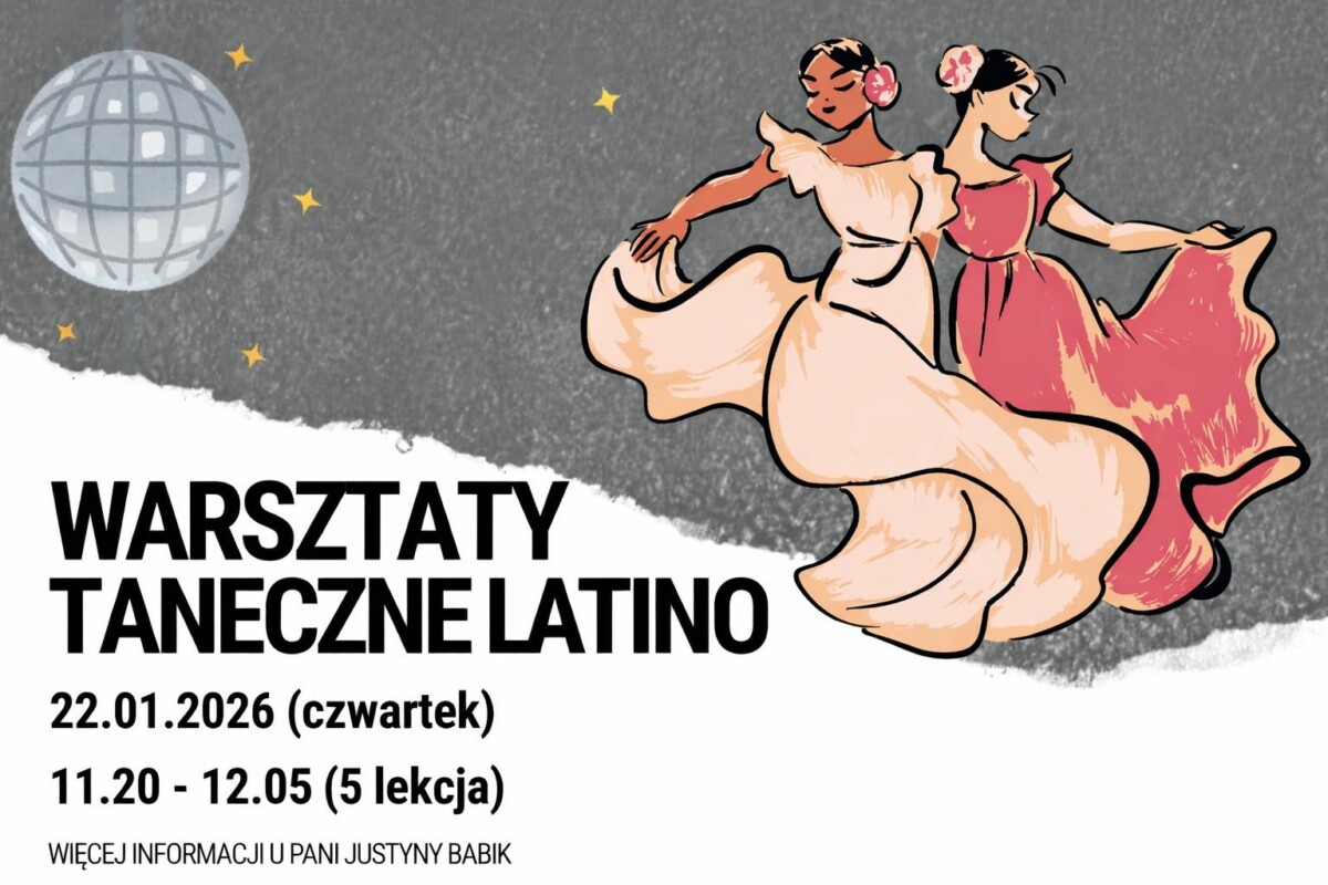 Zapraszamy na warsztaty taneczne Latino, które odbędą się 22.01.2026 (czwartek) w godzinach 11:20–12:05. To 45 minut pełnych energii, rytmu i radości z tańca, podczas których uczestnicy poznają podstawy tańców latynoamerykańskich i spędzą czas w świetnej atmosferze. Zajęcia są idealne dla osób, które chcą spróbować czegoś nowego i aktywnie się poruszać. Zapisy u Pani Justyny Babik.